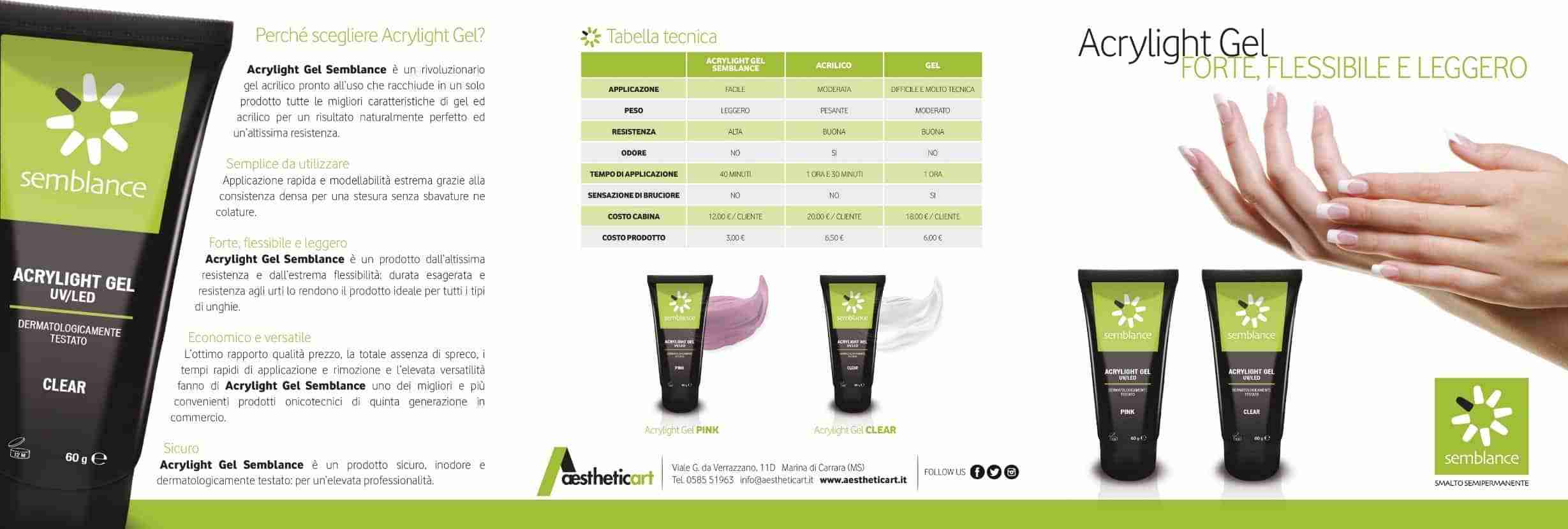 Acryilight gel di Semblance combina le caratteristiche di gel classico e polveri acriliche, ma essendo pronto per l’utilizzo ne dimezza i tempi.